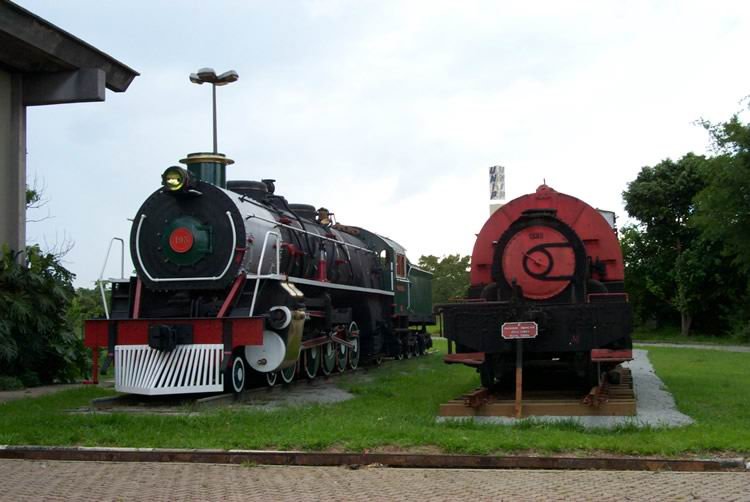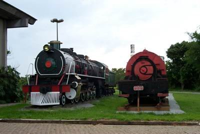 Duas locomotivas em exposição no Museu de Tecnologia, em São Paulo. Uma Henschel alemã de 1936 e uma Dubbs inglesa de 1888.